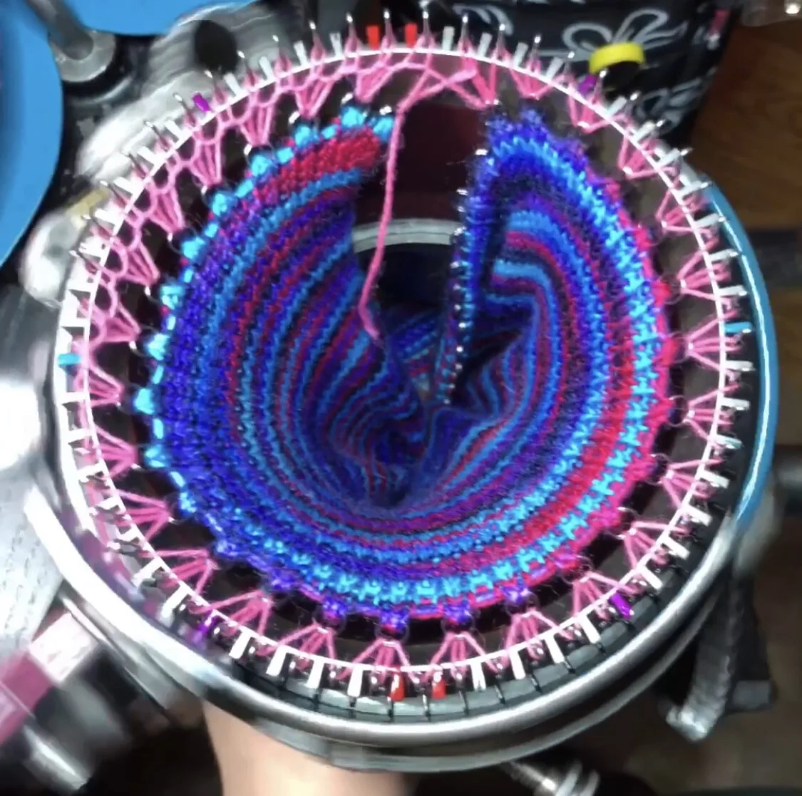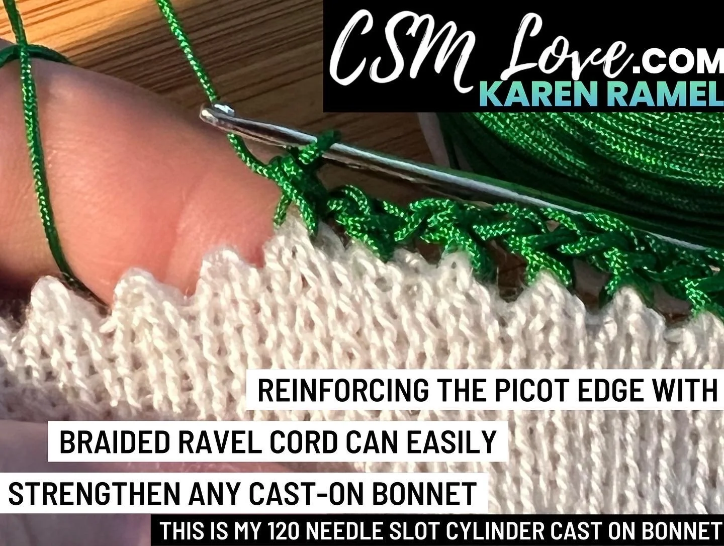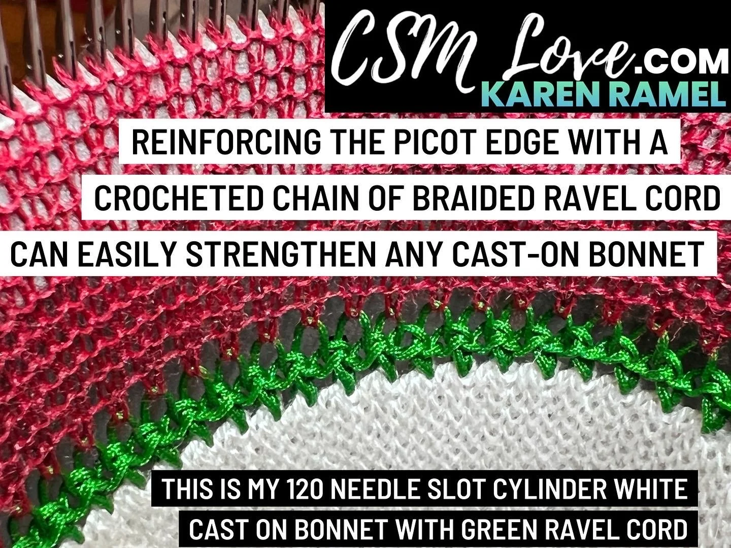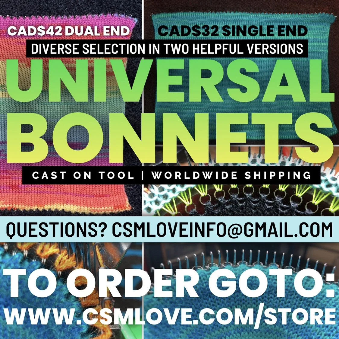 Introducing my ”Universal Bonnet” (a worked flat panel with 6mm split rings on one end) that can be built on your largest stitch count cylinder with or without the 6mm and can be used on ANY of your cylinders equal or of less needle slots to the one it was built on. A deluxe version is two ended - meaning rings are added to the beginning and end edges for a very useful bonnet.