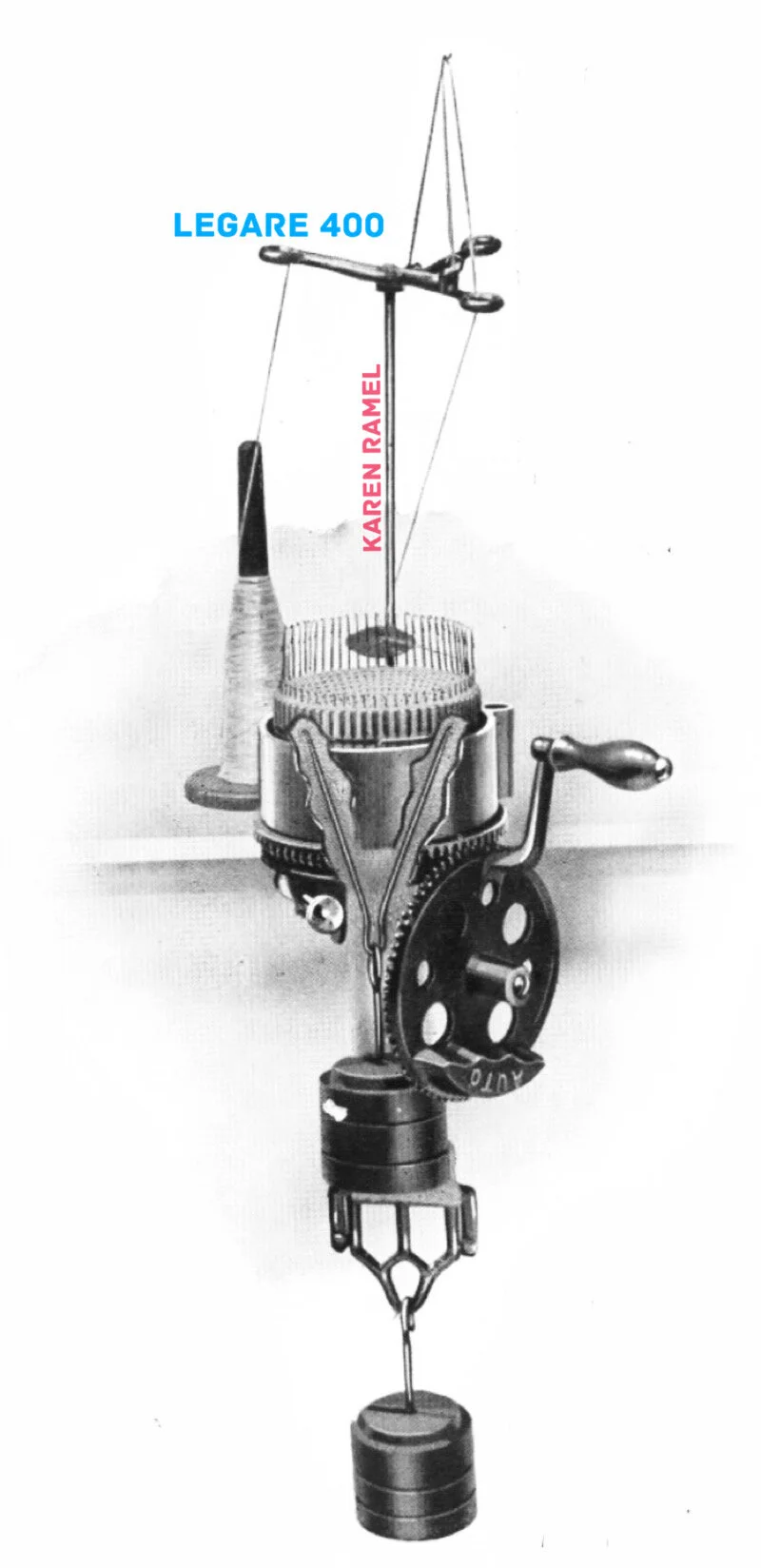 See below the newer “Legare 400” version with updated cog ring with adjustable stop (has screws that adjust contact yarn carrier timing)