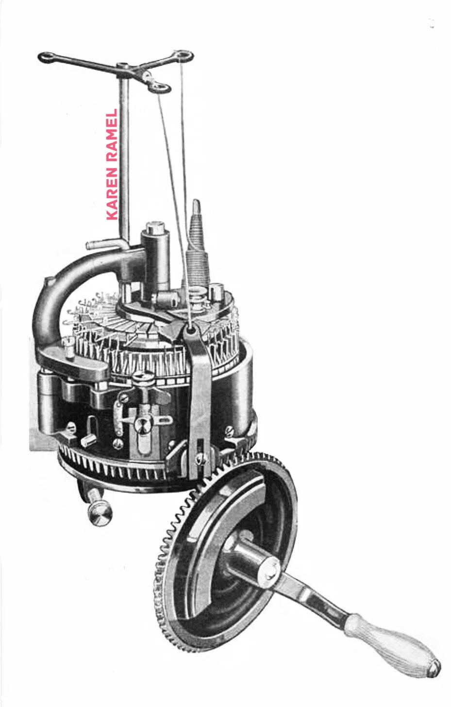 The vintage Gearhart crank has 50 teeth, an Auto Knitter has 72. Some old Creelman machines have a mount that could use both cranks.