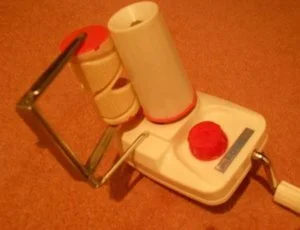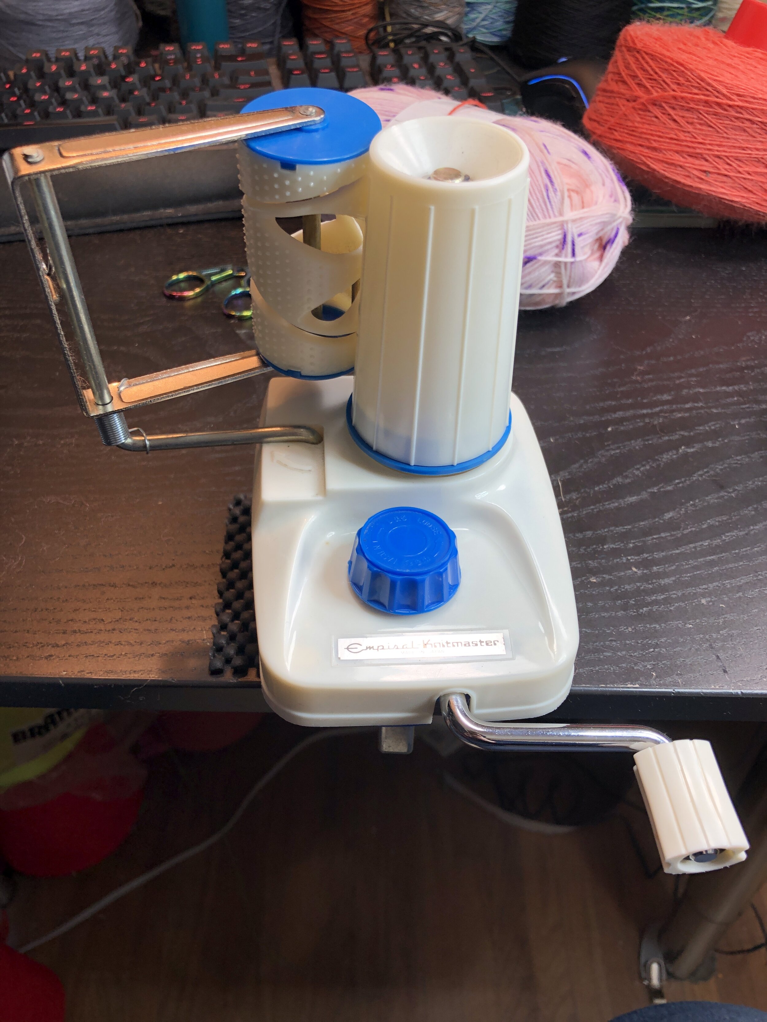 THIS IS MY ALL TIME FAVORITE MANUAL CONE WINDER - It goes by many names but always ONLY looks like the two shown (in either red or blue). Brand names seen include: Royal / Empisal / Brother / Toyota / Knitmaster / Silver Reed. This winder is no longer made but can sometimes be found on ebay or other online places. Cones for this winder are sturdy, stackable and can load over 200grams of sock yarn on one convenient cone!