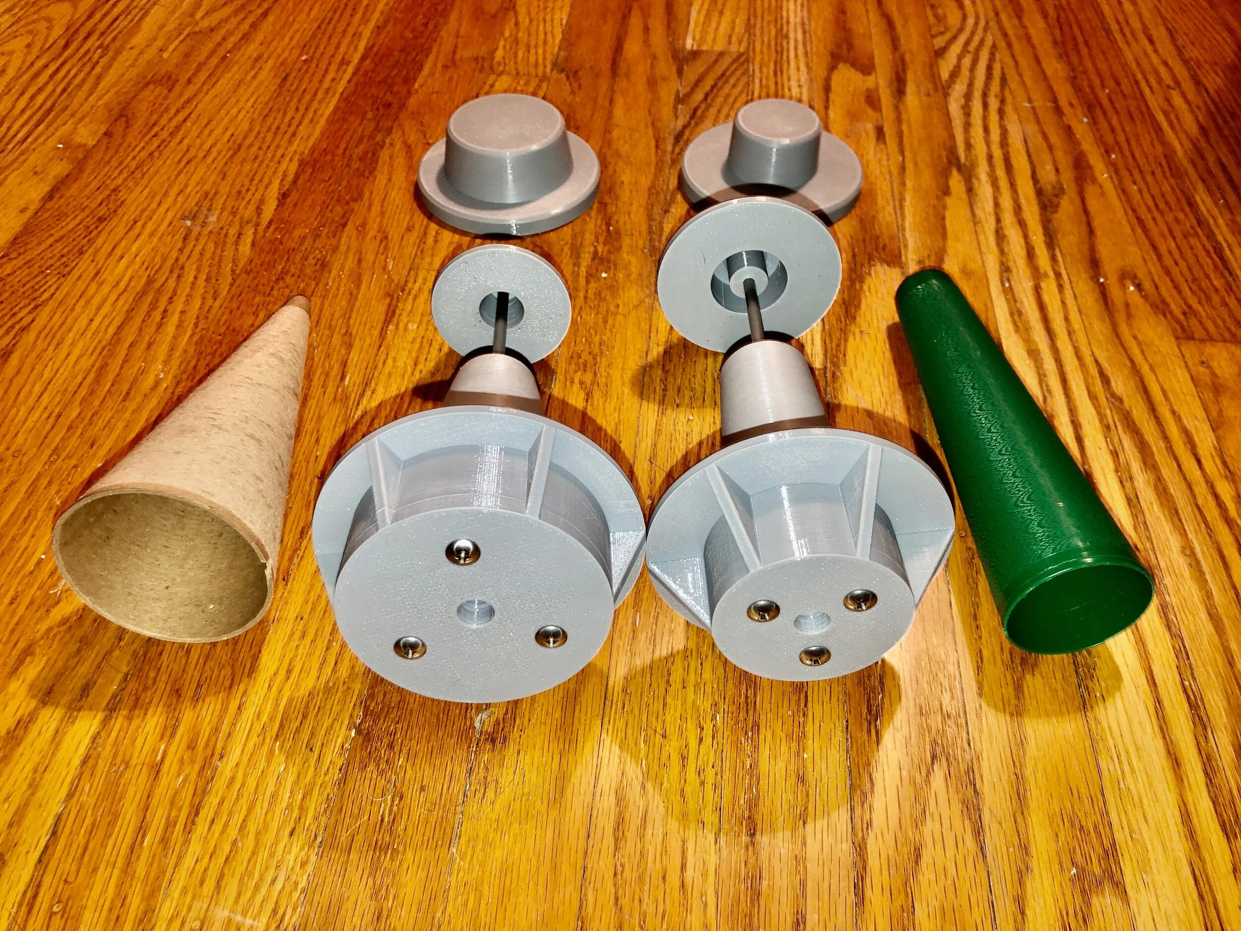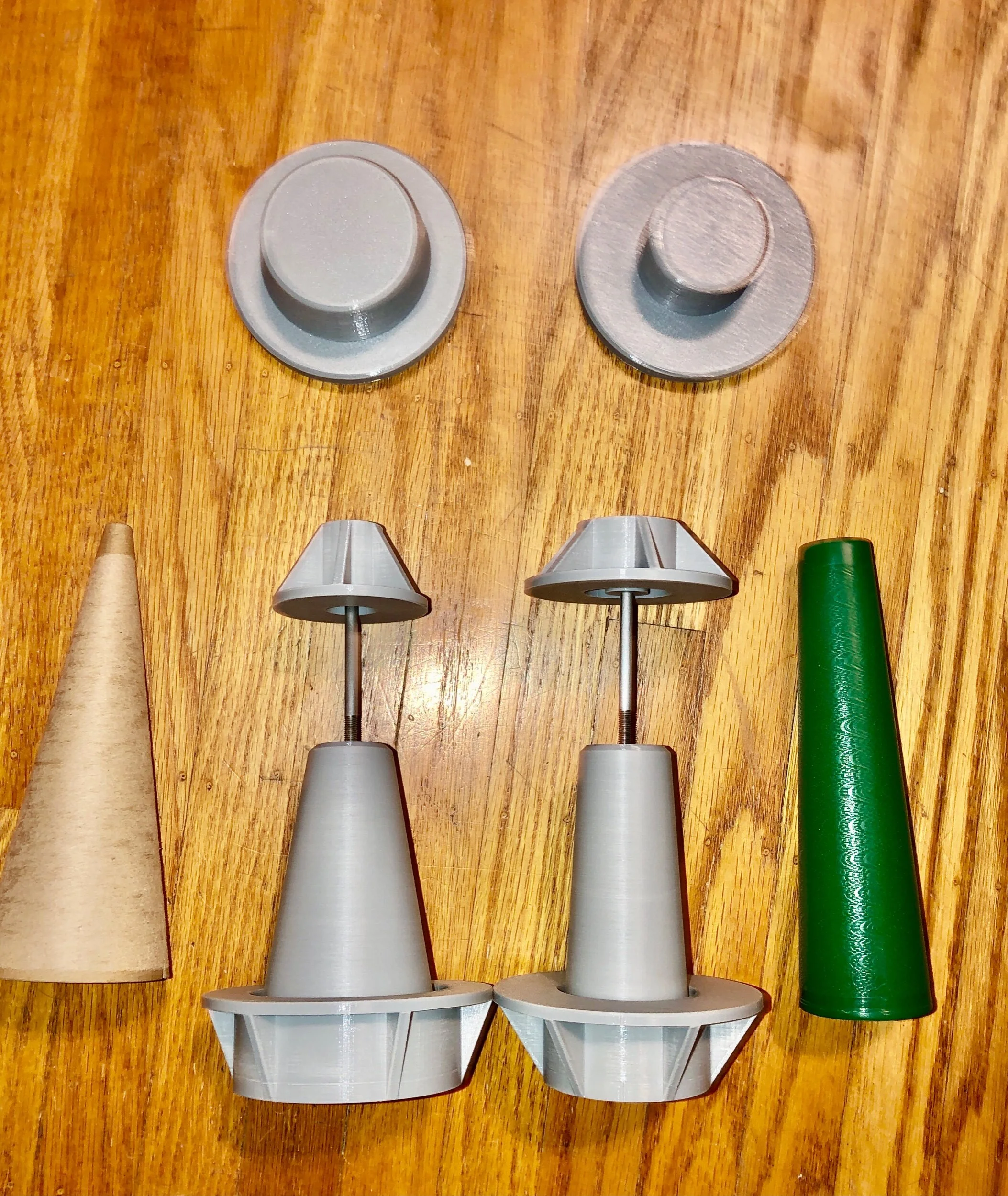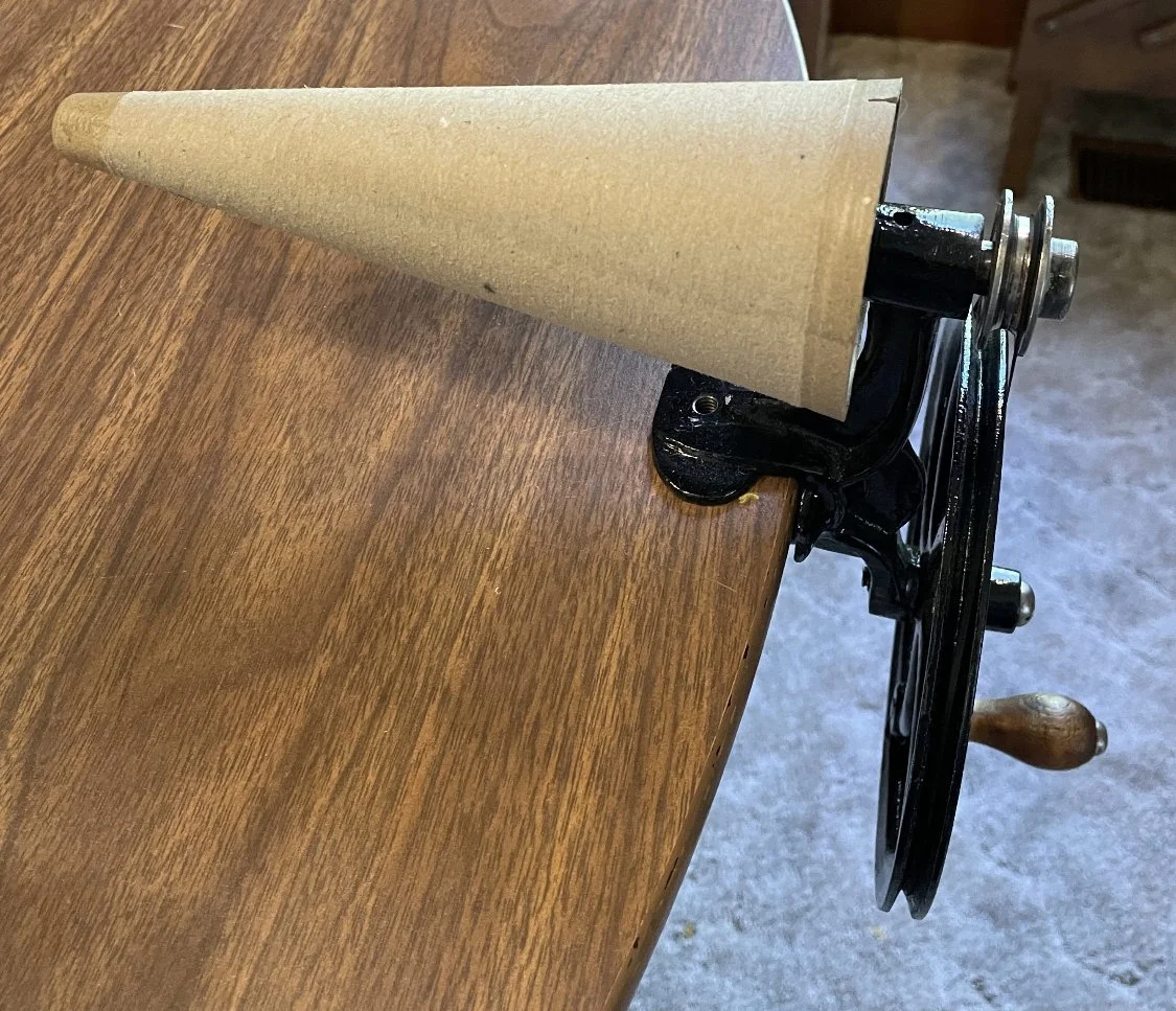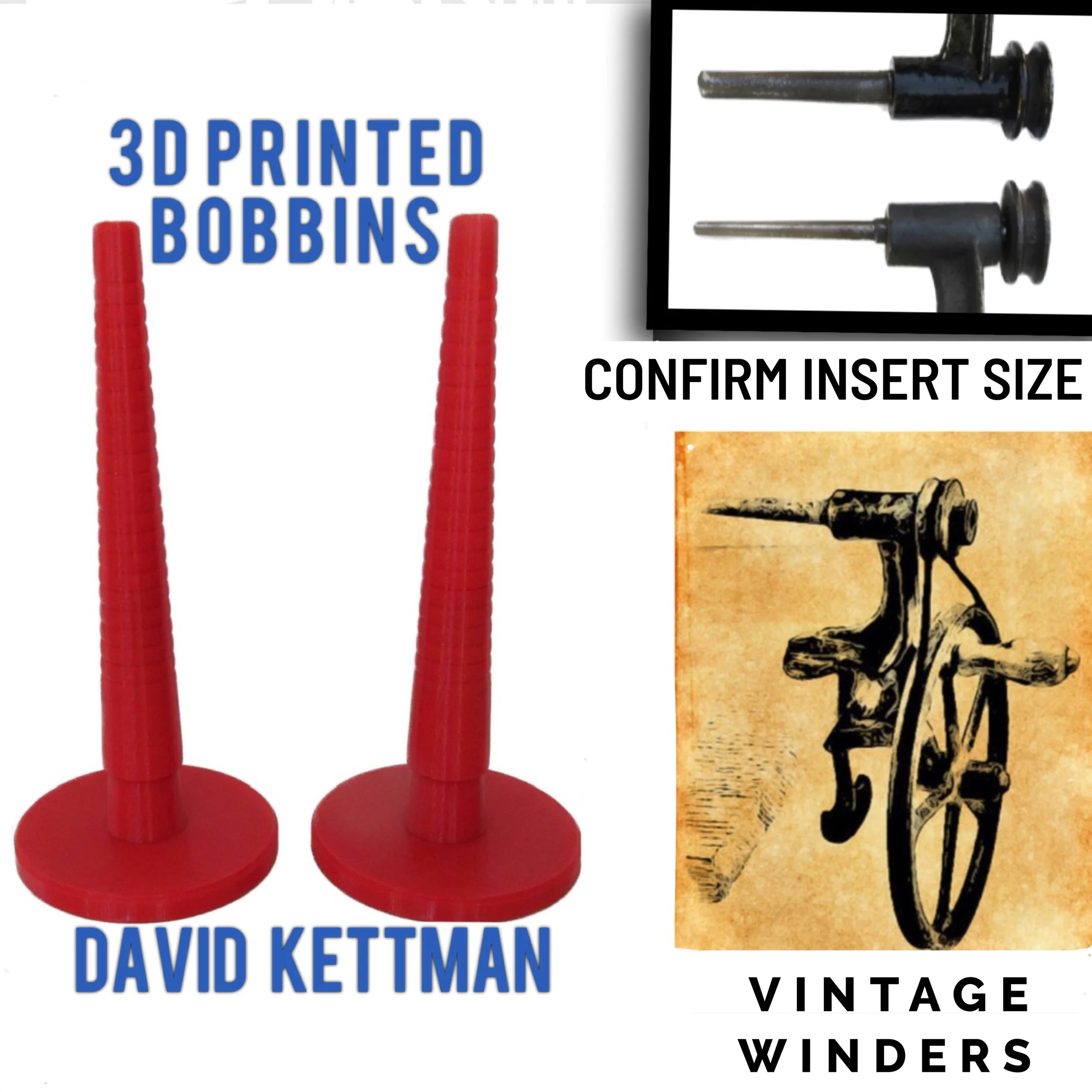 David Kettman offers a variety of 3D printed options including 3D printed bobbins or these adapters to use plastic/cardboard cones on this winder. Dave also 3D printed Royal Cone style cones. When using the vintage bobbin winder one still needs to manually direct the yarn. The contact info for David is listed above with available cones and is also found on the SUPPLIERS page.