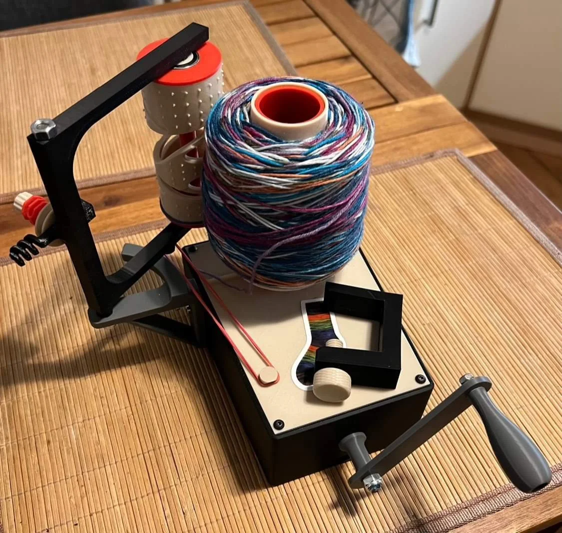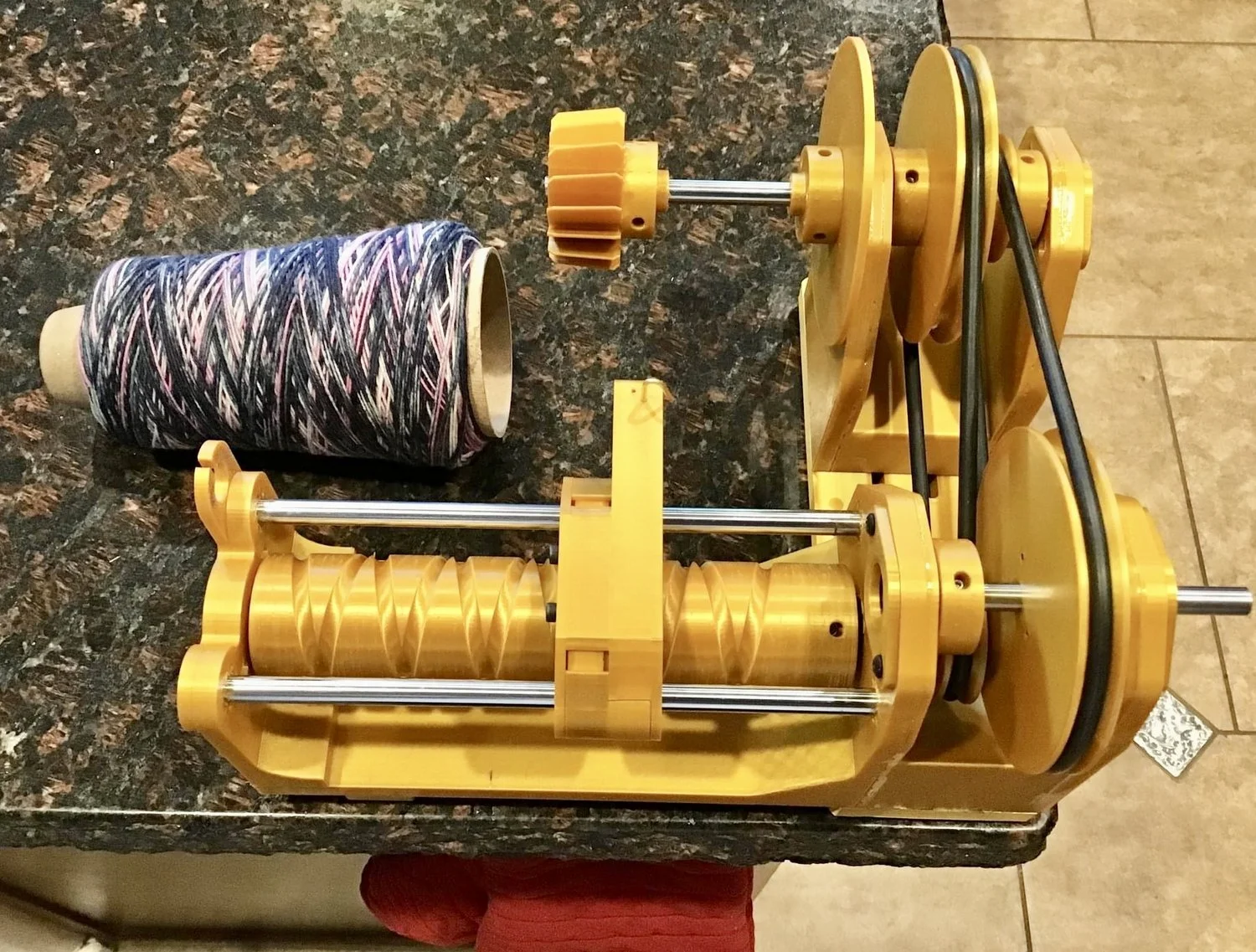 Heather took this vintage winder and upgraded it with 3D printed homemade parts to make an adapter that fit the spindle for cone using and a guide that directed the yarn onto that cone. | Email: heather.carter1@ntlworld.com